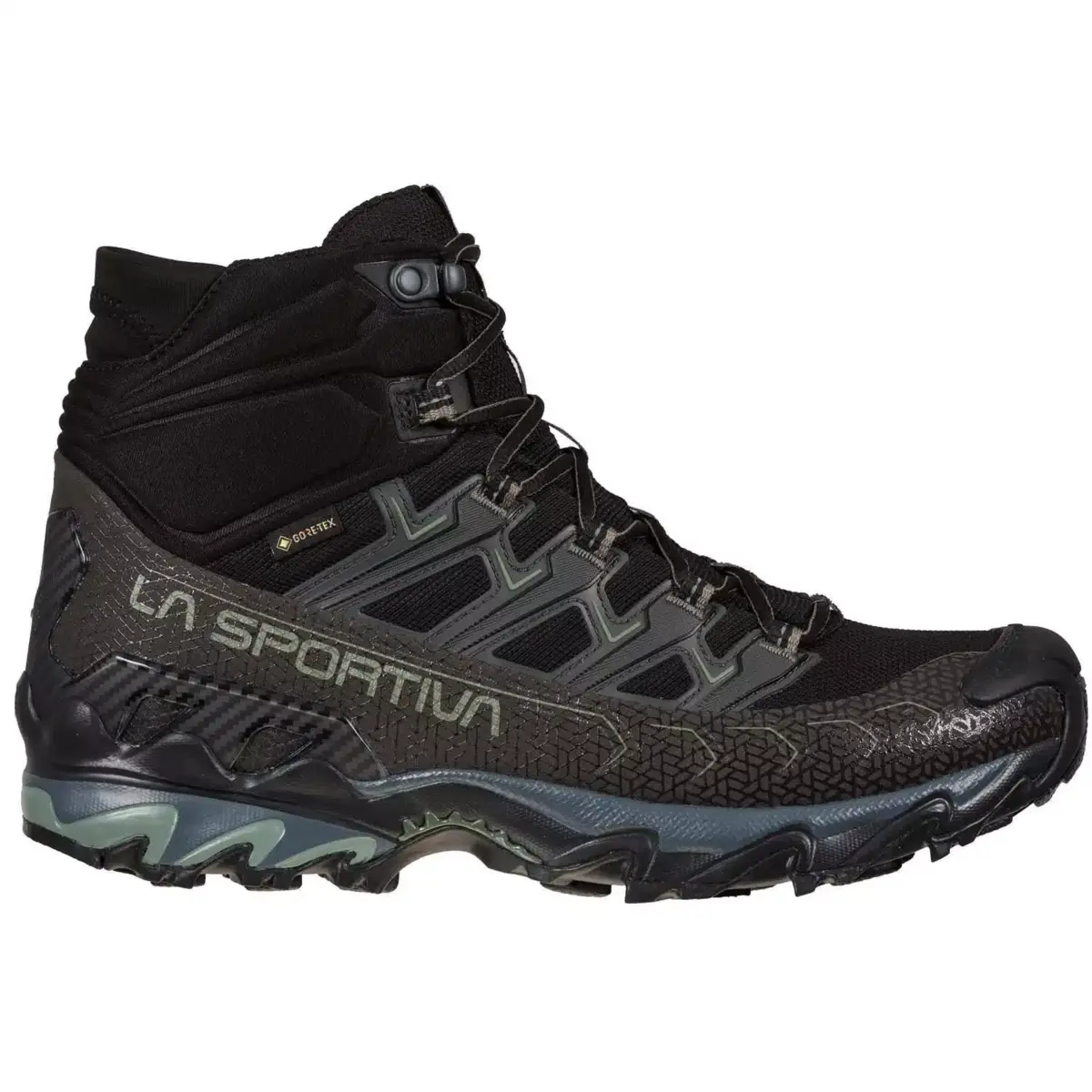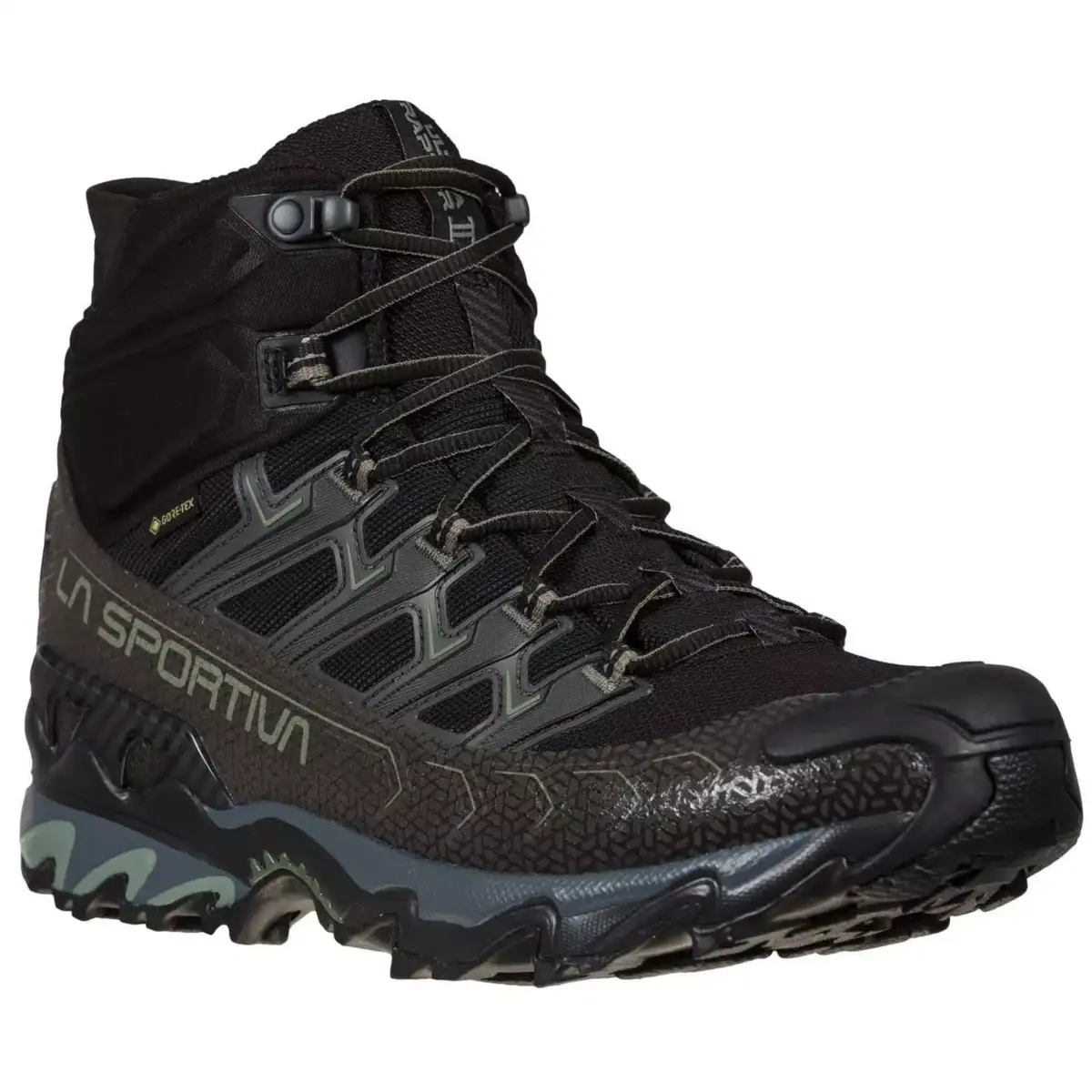 Ultra Raptor Mid II GTX is the mid-cut version of the Ultra Raptor Mountain Running icon, ideal for fast hiking and excursions with light loads. Waterproof and breathable thanks to the GORE-TEX Extended Comfort membrane. The soft Comfort Collar protects the ankle from the entry of stones or mud and integrates the easy-fit spoiler for maximum ease of fit. The upper is in abrasion-resistant, breathable mesh fabric, perfect for use in all conditions. The rear stabilizing heel allows perfect control over the traverses. Perfect volume adjustment and foot hold thanks to the dedicated lacing elements: the eye-stay webbings are sewn on the inside of the upper and reinforced on the outside with a high frequency TPU skeleton, allowing the lace pull-force to be distributed equally over all areas of the upper. Ultra Raptor Mid II GTX is also available in a wide-fit comfort version to accommodate different foot-volumes. The result is an mid cut hiking shoe that can be worn for many consecutive hours and suitable for off-road use on any type of terrain. Raptorize yourself, again.