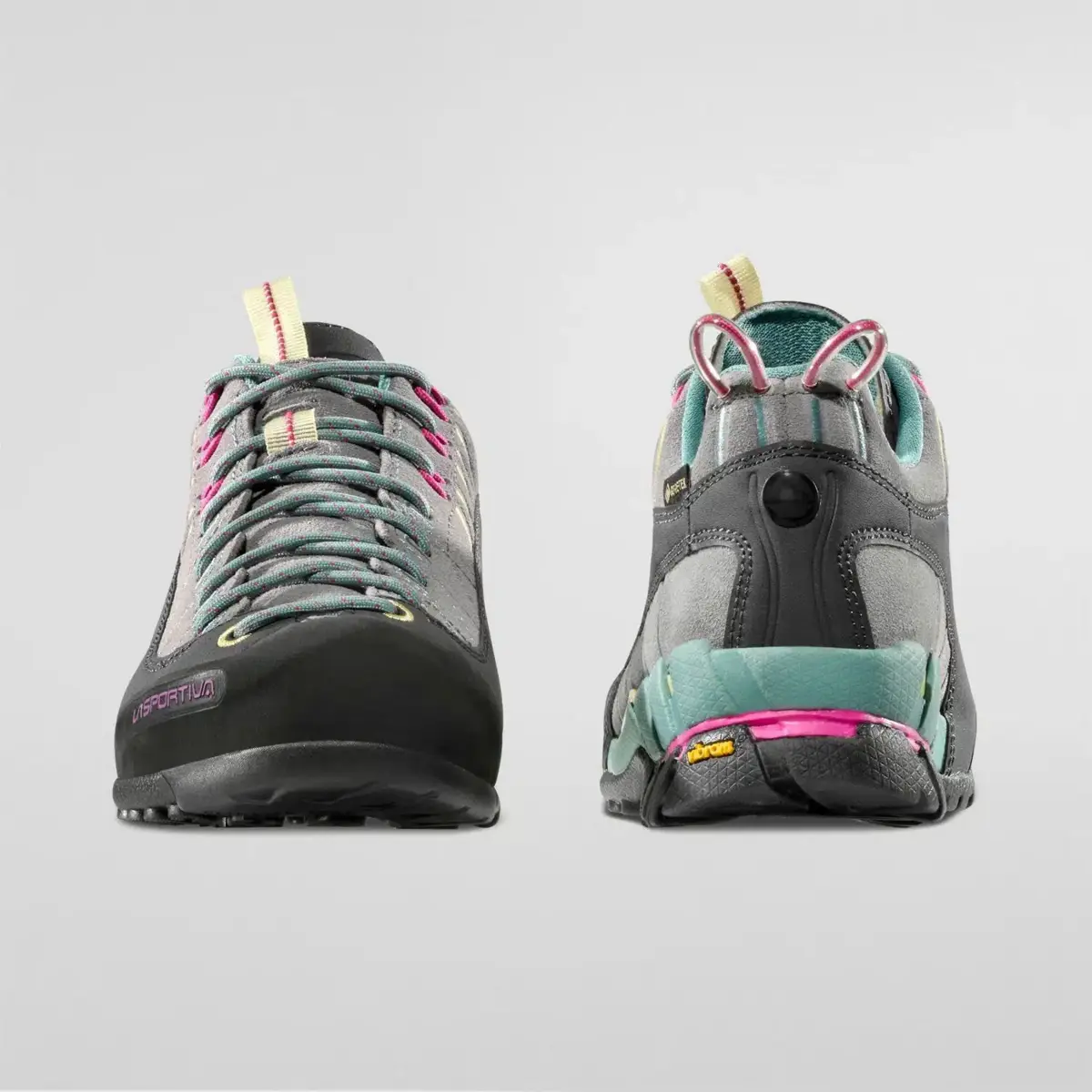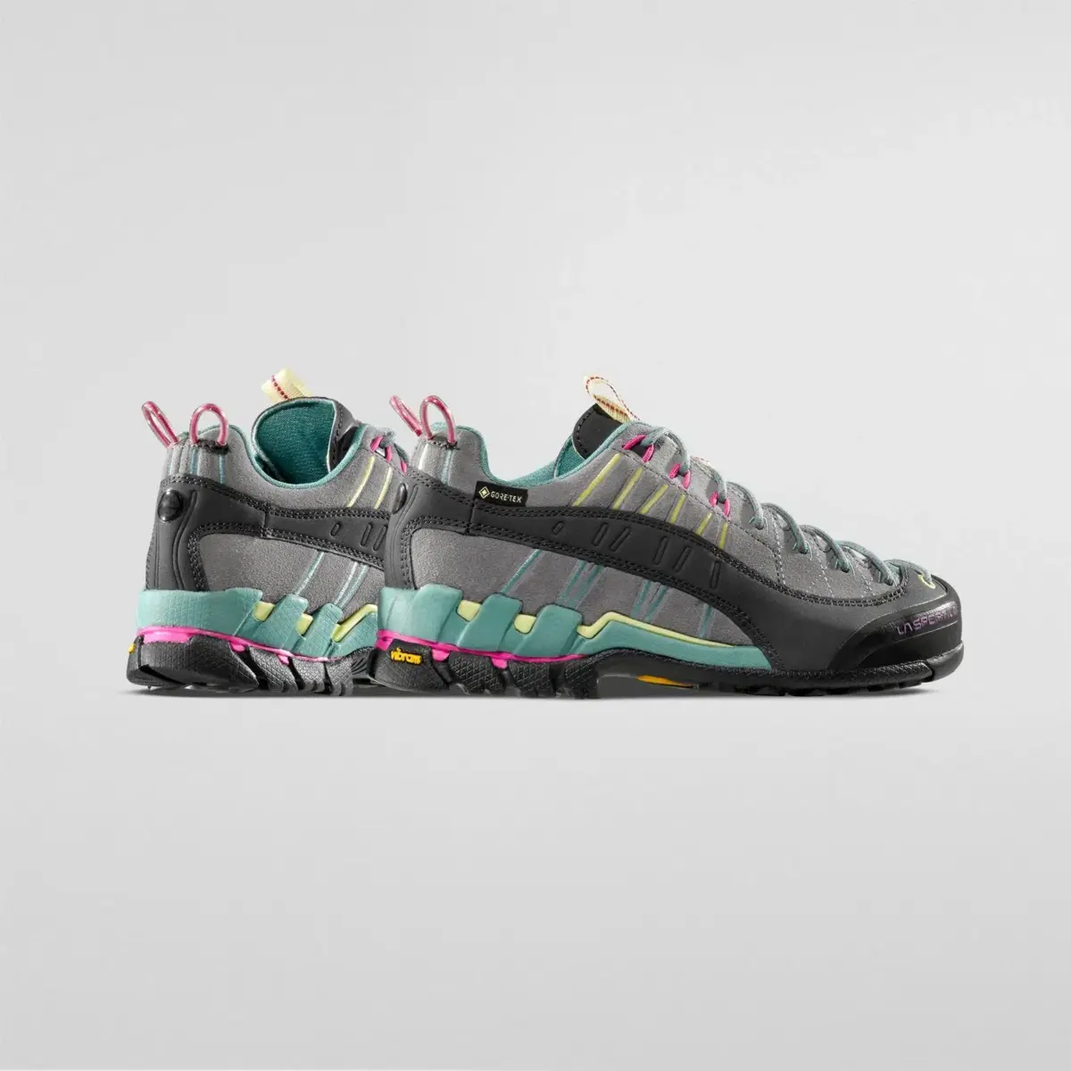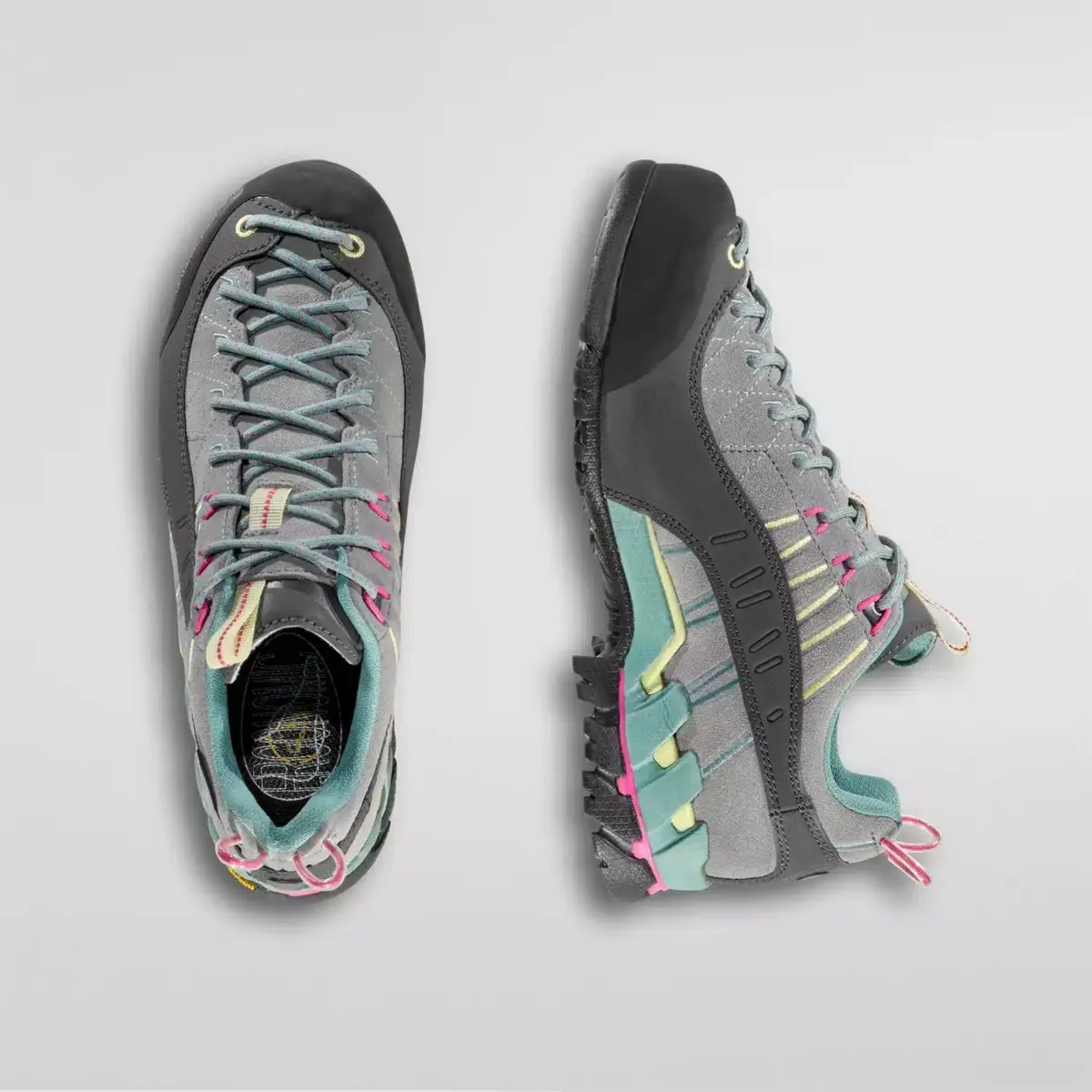 The Gore tex lining guarantees a lightweight, waterproof and breathable boot, thanks also to the mesh uppers. The precise, ergonomic fit is achieved by using the all-around pullstrings which hug the 360° clinking to the lacing system via a series of hoops and high frequency reinforcements. This construction method derives from the know-how gained by La Sportiva in the climbing scenario. The protective rubber toe-cap also derives from the climbing shoe. The midsole “Rock Guard” wedge contains a layer of EVA with an injected shock absorbing cushion at the heel and offers enhanced support to the ankle to avoid torsion of the foot.The Idrogrip Vibram sole has been created according to the specific characteristics and contains graded zones: the climbing zone at the toe, lateral suction pads of various sizes and a shock absorbing cushion at the heel.The most innovative La Sportiva technology applied to approach shoes.